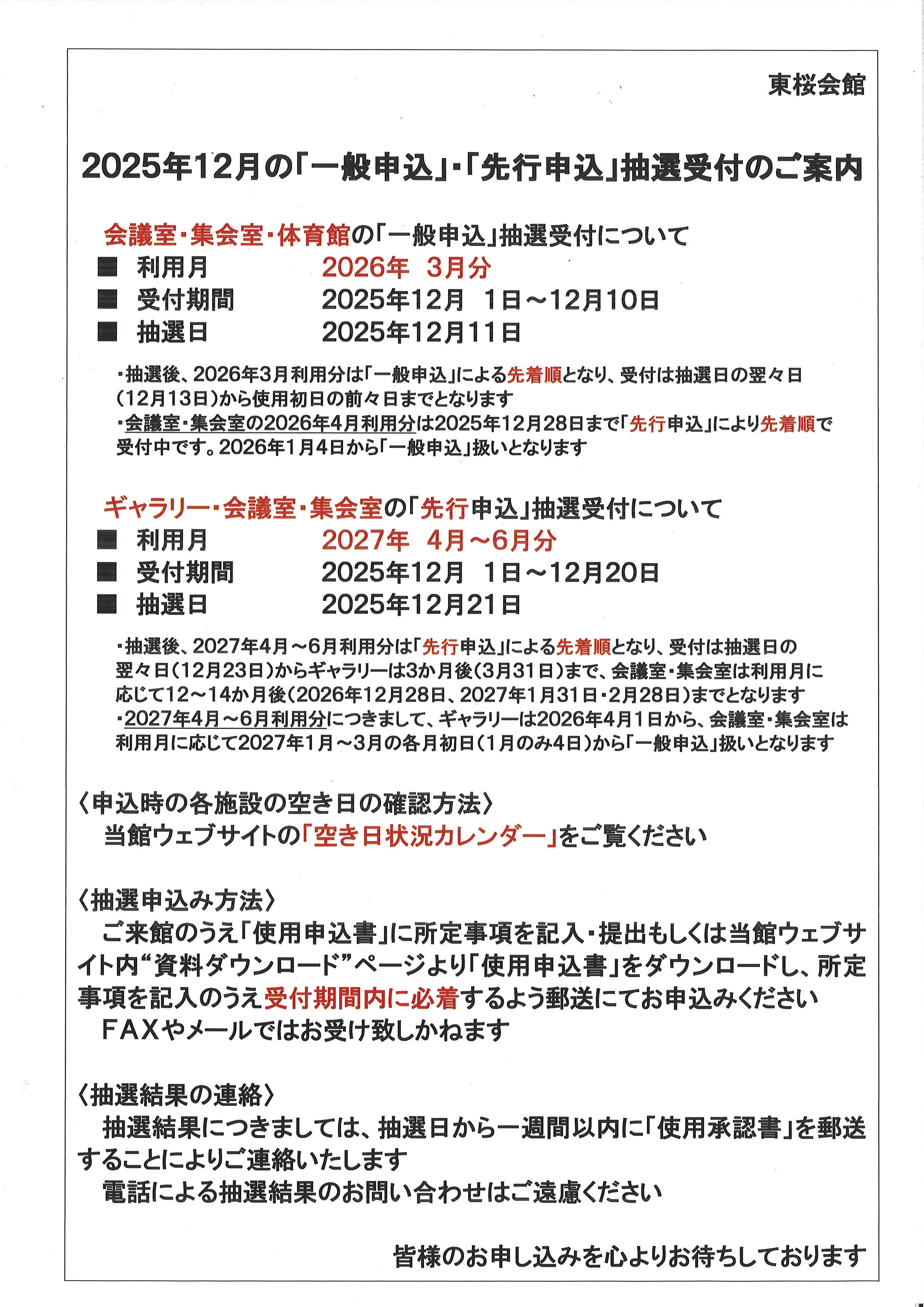 2025年12月の「一般申込」・「先行申込」抽選受付のご案内